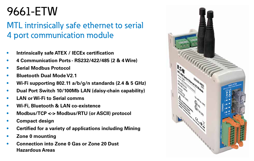 9661-ETW MTL 本质安全型千兆以太网四端口串行网关MTL 9661-ETW 模块允许具有 RS485/RS422 或 RS232/TTL 端口的现有本安型设备通过 Wi-Fi (WLAN) 或 Cat5/6 电缆连接到 IS 以太网网络 (LAN) 来启用以太网。该装置有 4 个串行端口,每个端口支持 RS485/RS422 或 RS232/TTL,具体取决于所需的配置。